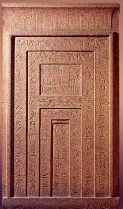 Many false doors were modelled on the "palace facade" design found on the outside of Early Dynasty Mastabas and on the outer wall of Djoser´s step pyramid. A Typical false door has a long, narrow recessed panel which represented the actual doorway. Above this, a semi-cylindrical moulding represented the reed mat generally used to close a real door. The narrow panel and moulding are set inside a rectangular frame, often topped by a by a rectangular panel decorated with an image the deceased sitting in front of an offering table. The offering table took the form of the "hotep" hieroglyph (a breadloaf on a reed mat representing an offering) and the offering formula was genetrally inscribed around him or her. Outside this is was common for there to be an architrave (a rectangular frame). The False door was usually placed on a lintel (false or real) that extended across the door jambs and generally included up to three pairs of jambs leading to a central niche.