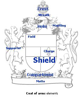 crest - a figure or device (originally borne by a knight on his helmet) placed on a wreath, coronet or chapeau and borne above the shield and helmet in a coat of arms; the apex or ''cone'' of a helmet; hence a helmet or head piece + COAT OF ARMS
