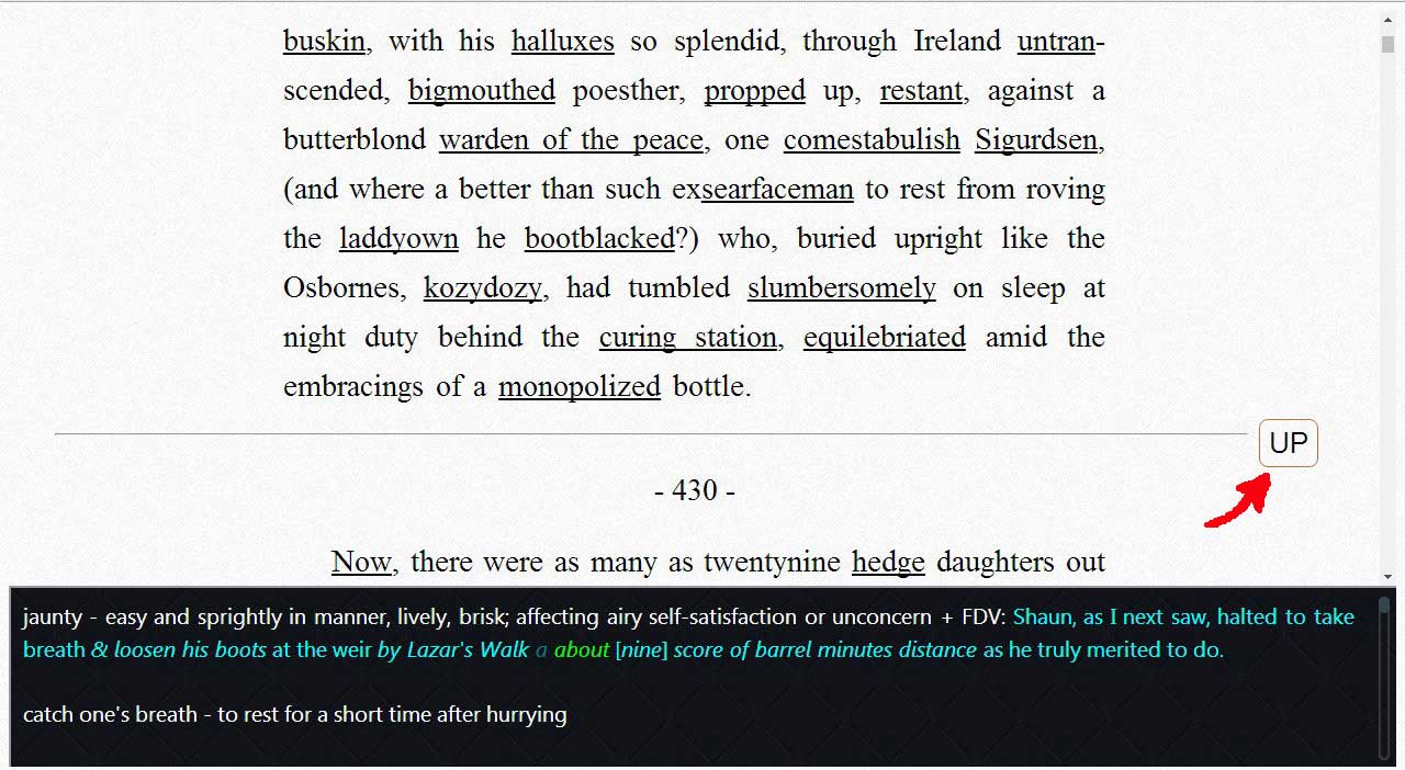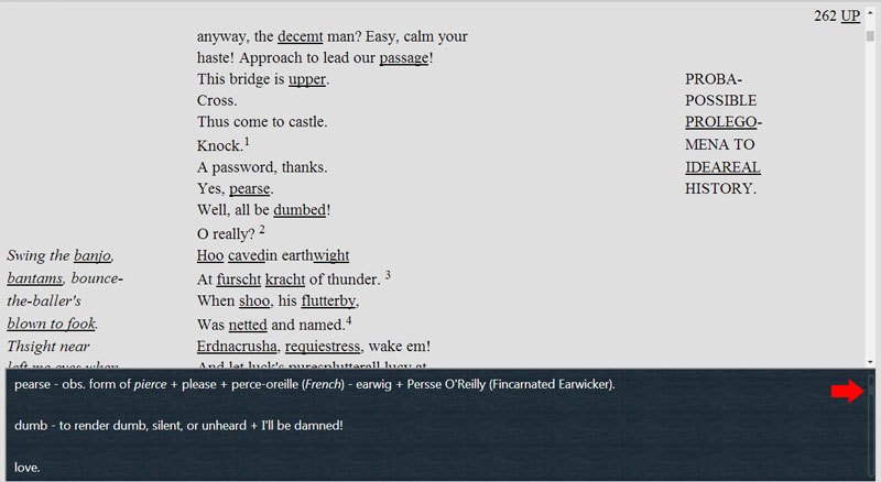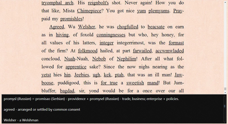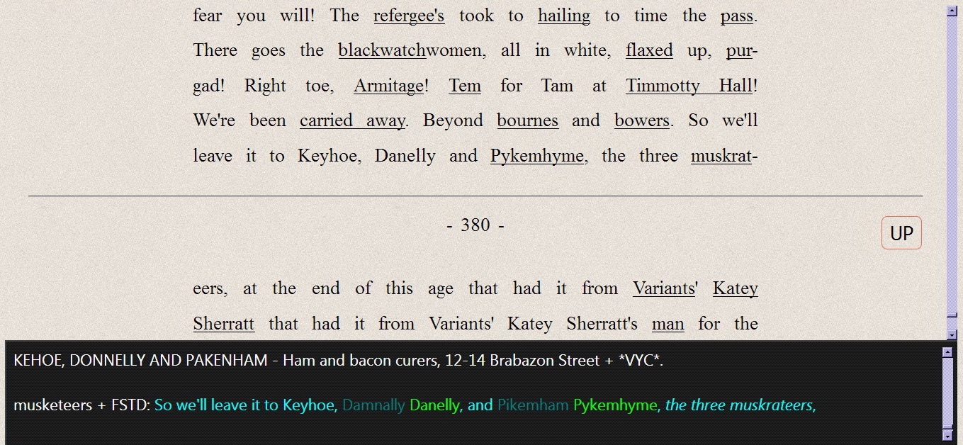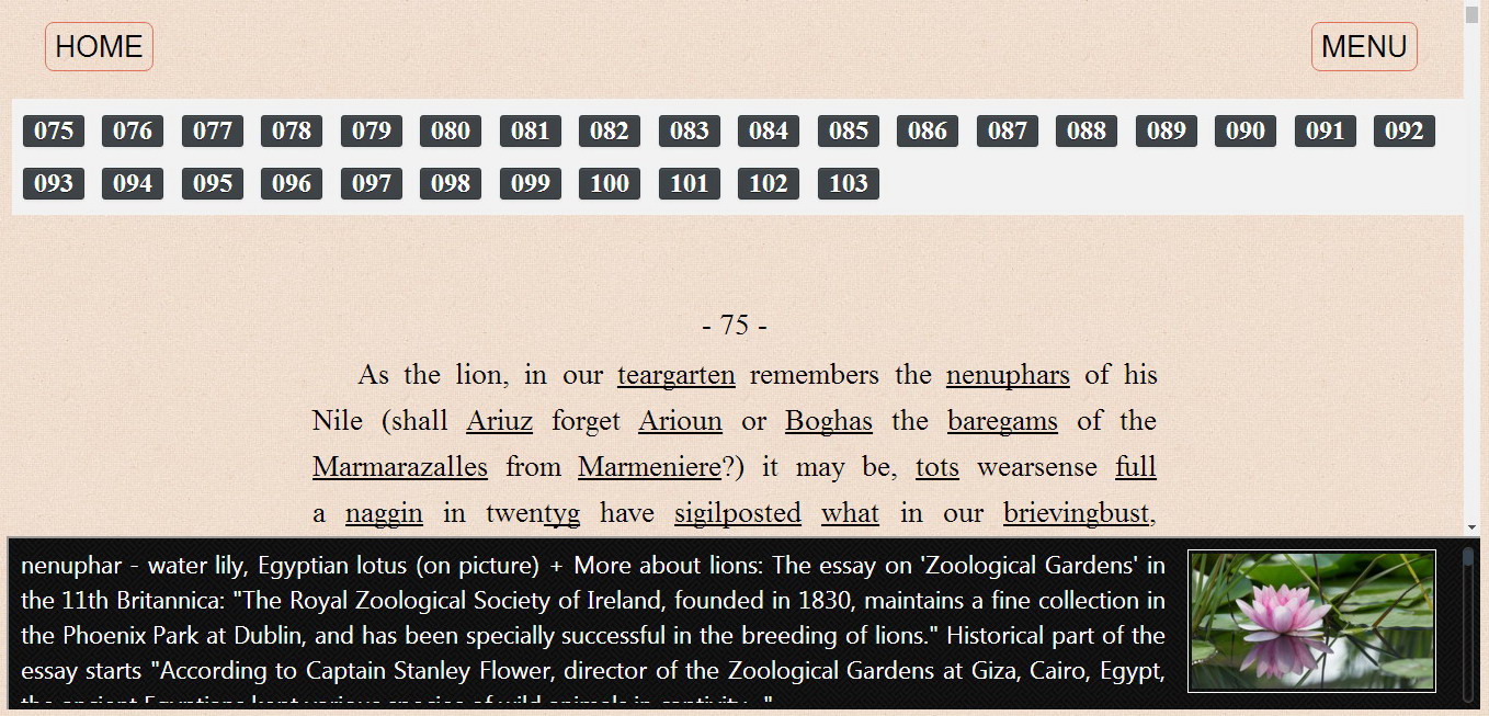 New's code's "Responsif you plais" means that site makes use of flexible layouts, flexible images and cascading style sheet media queries. Essentially, responsive design of finwake automatically scales its content and elements to match the screen size on which it is viewed. Moreover, in 2023 premium edition, line spacing is defined as 1.3 of standard line height for better readability (lines that you are reading just now are fixed at 2.0 line height). Font of the footnotes is determined as Geneva, -apple-system, system-ui, BlinkMacSystemFont, "Segoe UI", Roboto, i.e. fonts that best suit device on which footer is loaded. "San Francisco" is Apple System Font, "Roboto" is Andorid's, "Segoe UI" best suits Microsoft devices, etc., and font of this text is adjusted for your reading device. Incidentally, background of this text has the same color as blank paper of Finnegans Wake paper edition from 1975 - strangely pink un', and that background is implemented in justified version of FW text Chapter 1, through a "constant labor to make a ghimel pass through the eye of an iota" exemplified in trials to text-align: justify; which is proven nightmare and receipt for disaster for every webmaster.